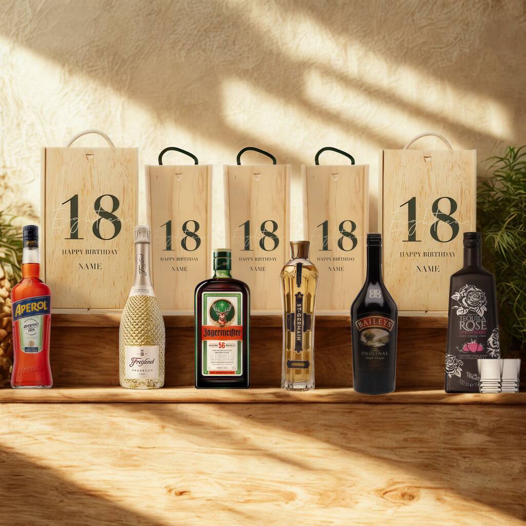 Mark a special 18th birthday with this personalised aperitif gift set, allowing you to choose from a range of iconic liqueurs and aperitif favourites. From sweet and creamy to floral or bold and herbal, this versatile gift offers something for every taste. Specific selected options include glass & mixer – premium variants include added extras for a complete gift experience. Presented in a stylish wooden box with a personalised lid, it’s the perfect way to celebrate a milestone occasion.