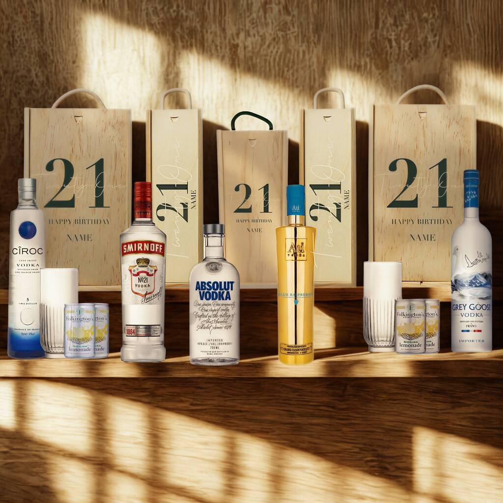 Mark a special 21st birthday with this personalised vodka gift set, allowing you to choose from a range of iconic vodka brands to suit their taste. From smooth and classic to bold and fruity or ultra-premium options with glassware and mixers, this versatile gift offers something for everyone. Only specific selected options include glass & mixer – premium variants include added extras for a complete gift experience. Presented in a stylish wooden box with a personalised lid, it’s the perfect way to celebrate a milestone occasion.