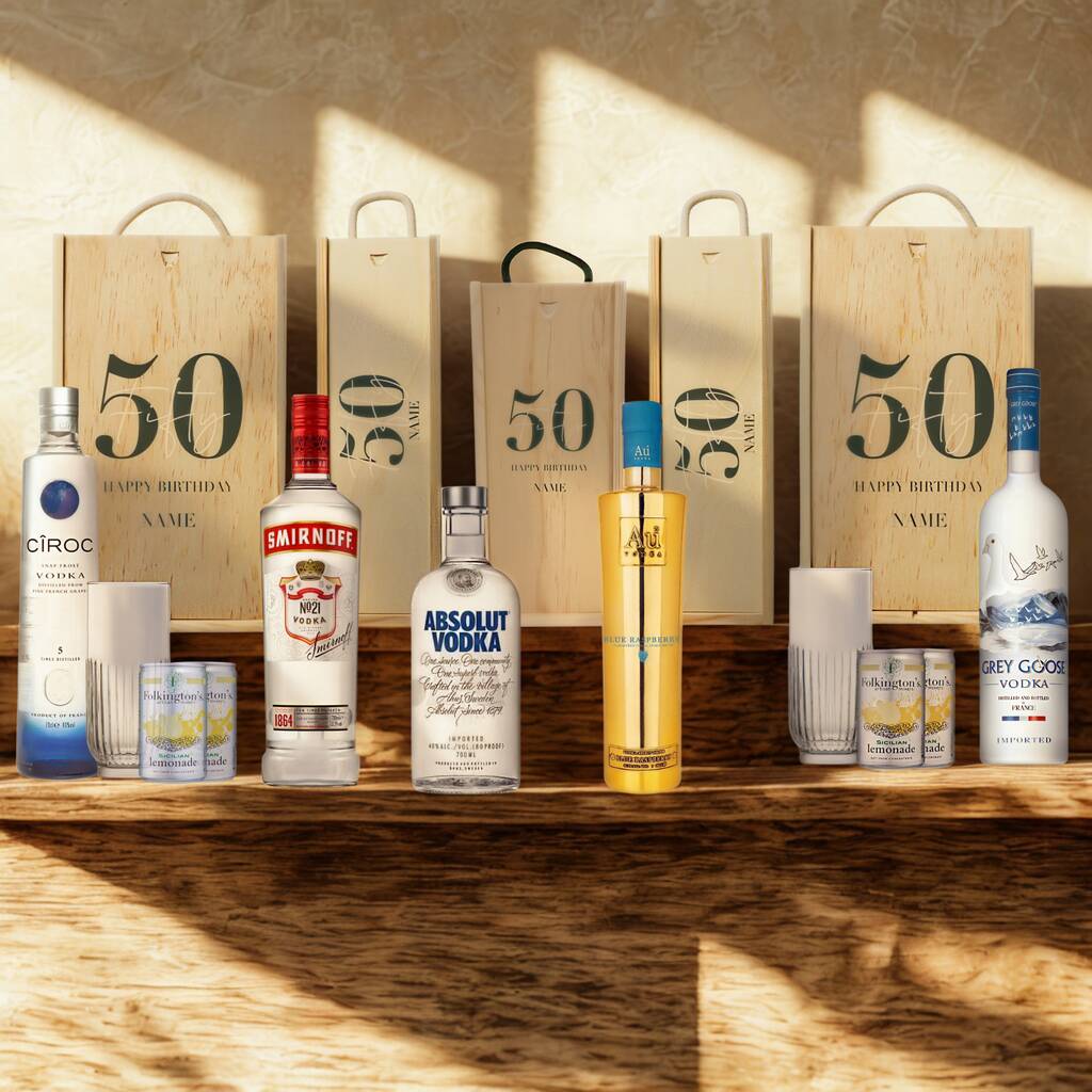 Celebrate a milestone 50th birthday with this personalised vodka gift set, featuring your choice of premium vodka and a custom lid.
