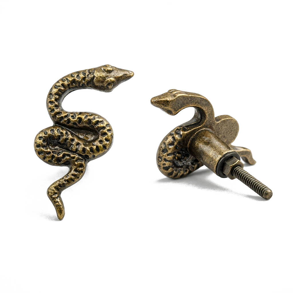 Striking antique brass serpent drawer knob, intricately detailed, durable and bold, perfect for adding unique character and vintage charm to furniture pieces.Make a bold statement with this intricately designed serpent-shaped brass drawer knob, crafted to bring character and individuality to your furniture. Featuring detailed texturing and a rich antique finish, it captures the elegance of vintage artistry while adding a distinctive edge to cabinets, drawers, and desks.