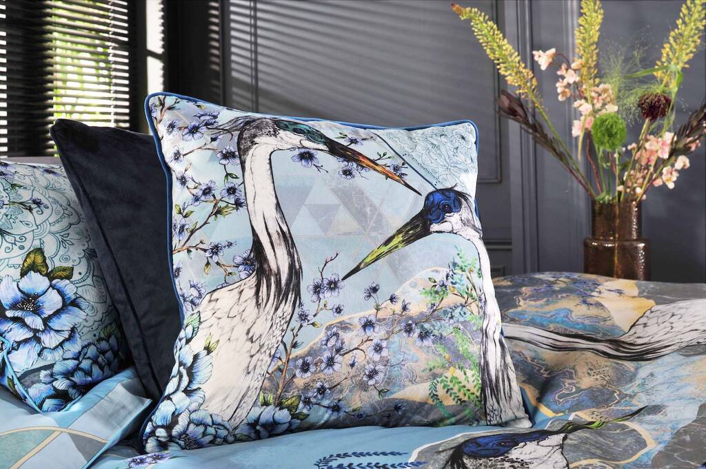 Air, Earth And Water Velvet Elements Cushion With Japanese Crane Birds