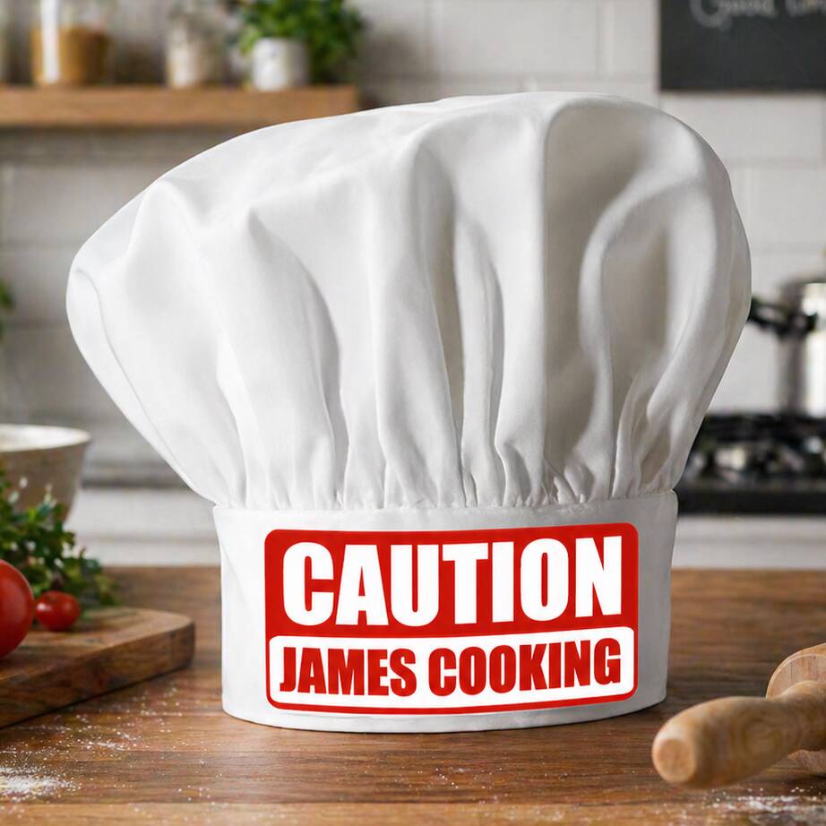 The hat features the hilarious phrase ‘CAUTION [Name] COOKING’ splashed across the front in big, bold, bright red capital letters that nobody could possibly miss. It’s cheeky, it’s eye-catching, and it’s guaranteed to put a smile on the face of anyone who sees it, even if they’re nervously wondering what’s about to come out of the oven.