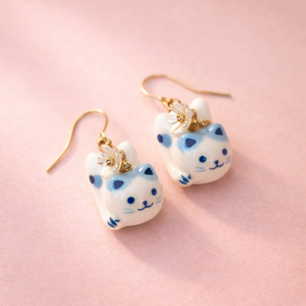 Cat Charm Drop Earrings With Cherry Blossom Detail