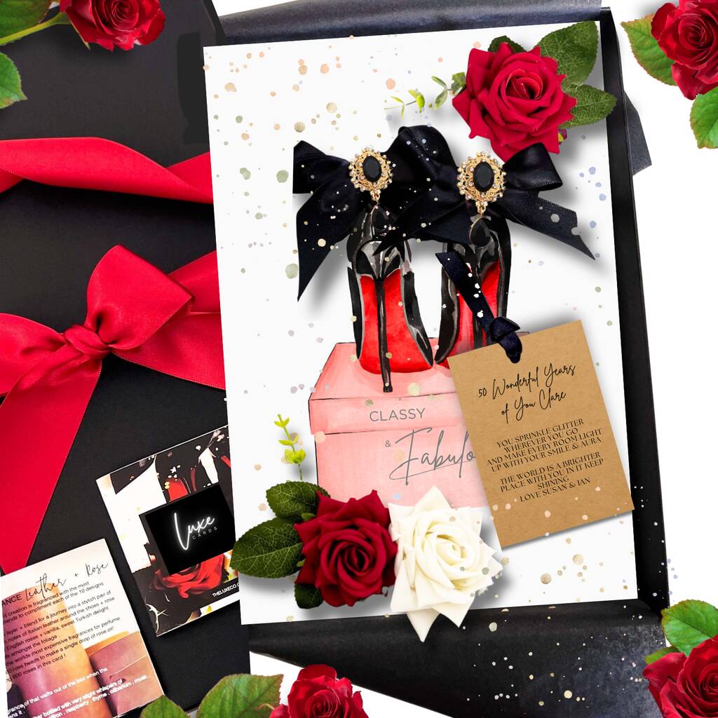 Scented Bloom Cards are truly unique personalised birthday cards for her, designed to celebrate a 50th birthday milestone in style. A meaningful birthday gift for her, this luxury handmade card features an artist-painted watercolour stiletto heel design by our in-house artist Lils.