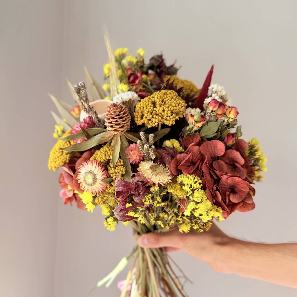 Dried Yellow Flower Bouquet With Deep Red Hydrangea
