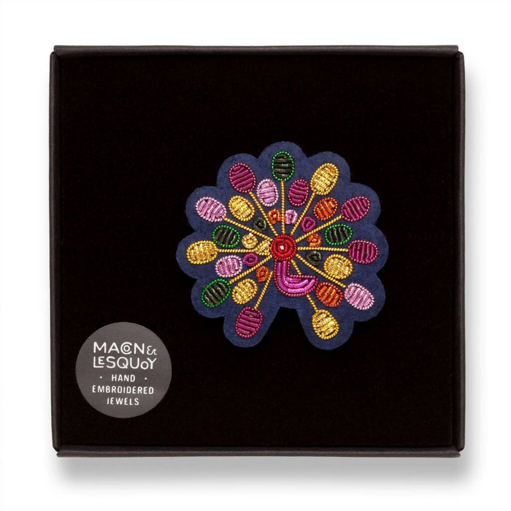 A vibrant hand-embroidered peacock brooch by MACON & LESQUOY — a wearable work of art crafted using the delicate traditional cannetille technique.This stunning peacock brooch is individually embroidered by hand using cannetille thread — a centuries-old Indo-Pakistani technique that gives every piece its own unique character. Designed in France by the playful brand MACON & LESQUOY, it makes a truly special peacock jewellery gift for those who appreciate artisan craftsmanship. Lightweight and easy to wear, it adds a bold splash of colour and personality to jackets, bags, or hats. Each brooch is a miniature artwork, stitched with wit, charm, and remarkable attention to detail.