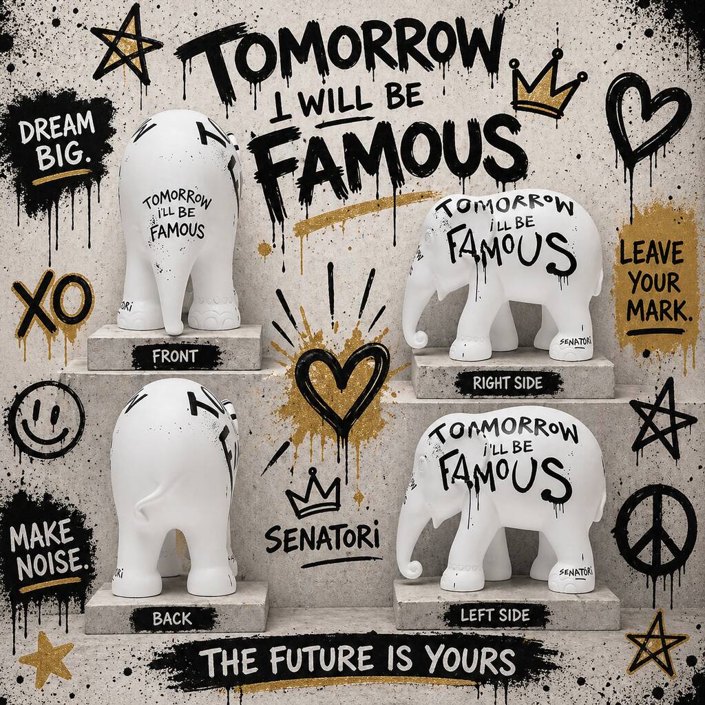 The Tomorrow I Will Be Famous elephant by Selwyn Senatori inspires bold ambition, urging you to embrace your true self and create your own future.The Tomorrow I Will Be Famous elephant, designed by Selwyn Senatori for the Laren 2017 Parade, celebrates ambition and self belief, encouraging you to pursue dreams fearlessly and create your own truth. Each Elephant Parade Limited Edition Original Replica is a meaningful, hand painted collectible, uniquely crafted so no two are identical. Every purchase supports elephant conservation efforts worldwide. Presented in an elegant black gift box with an official certificate detailing artist, collection, production number, year, and parade city, these symbolic elephants bring wisdom, strength, luck, positivity, and prosperity, enhancing any home or workspace with joyful, uplifting energy for all.